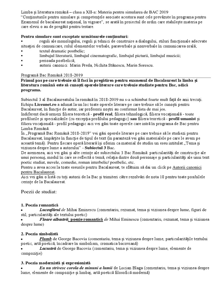 Programa Pentru Bacalaureat 2018 La Limba Romană Profil Umanist