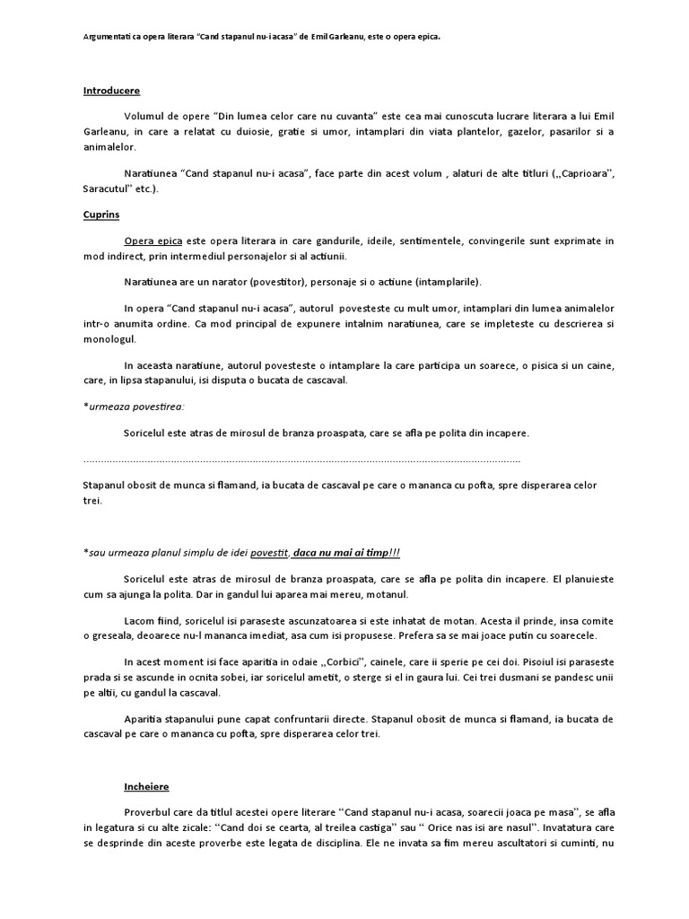 Când stăpânul nu i acasă de emil gârleanu. De emil gârleanu în odaie liniște. Pe polita din dreapta pe o farfurie sta uitata o bucata de cascaval. Mirosul de brânză proaspătă a străbătut până în cel mai îngust colţişor al casei. Pe poliţa din dreapta pe o farfurie stă uitată o bucată de caşcaval.