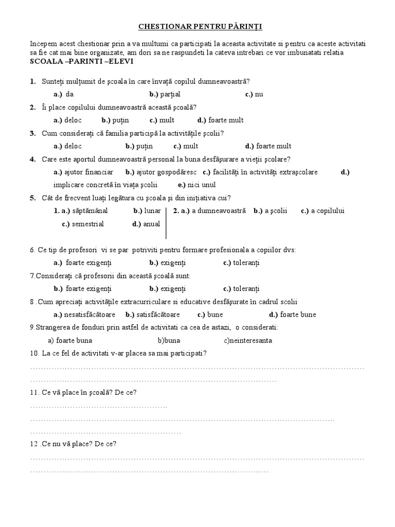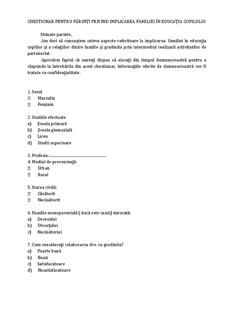Chestionar Pentru Părinţi Privind Implicarea Familiei In Educaţia Copilului Docx