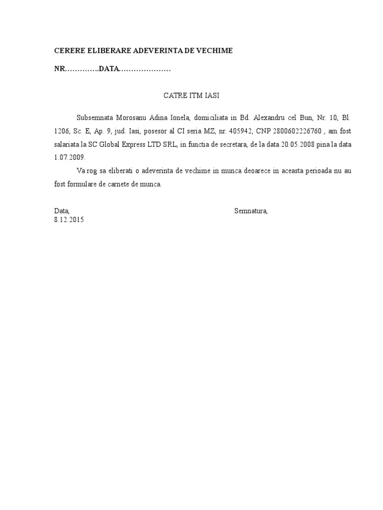Model Cerere Eliberare Adeverinta Vechime In Munca