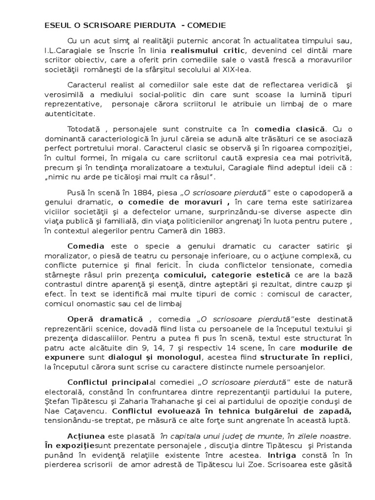Eseu O Scrisoare Pierduta Comedia