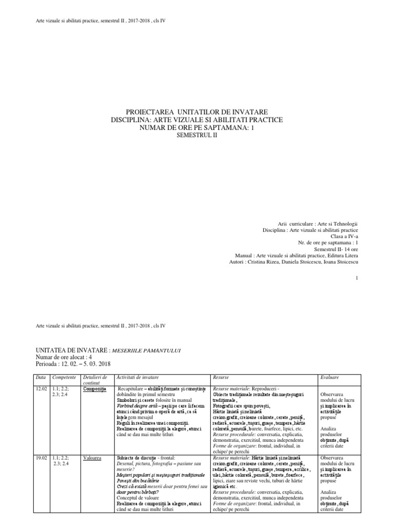 Proiectarea Unitatilor De Invatare Disciplina Arte Vizuale Si Abilitati Practice Numar De Ore Pe Saptamana 1