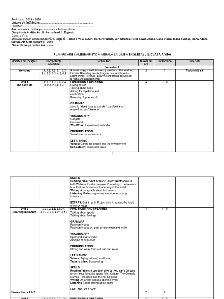 Planificare Calendaristică Limba Engleză 2018 2019 Clasa A Vi A Vocabulary Adjective
